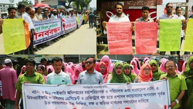 নওগাঁয় শিক্ষকদের মানববন্ধন ও নার্সদের প্রতিবাদ কর্মসূচি